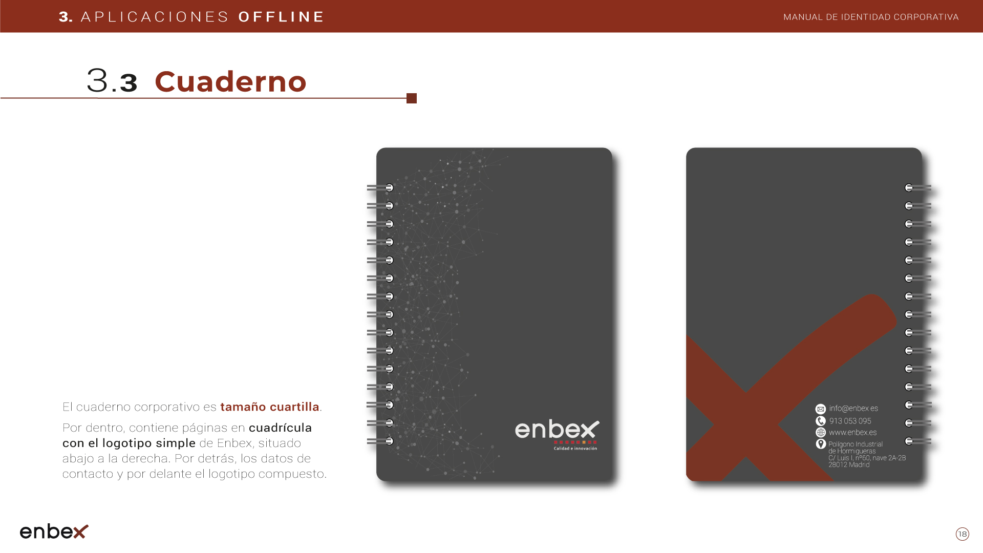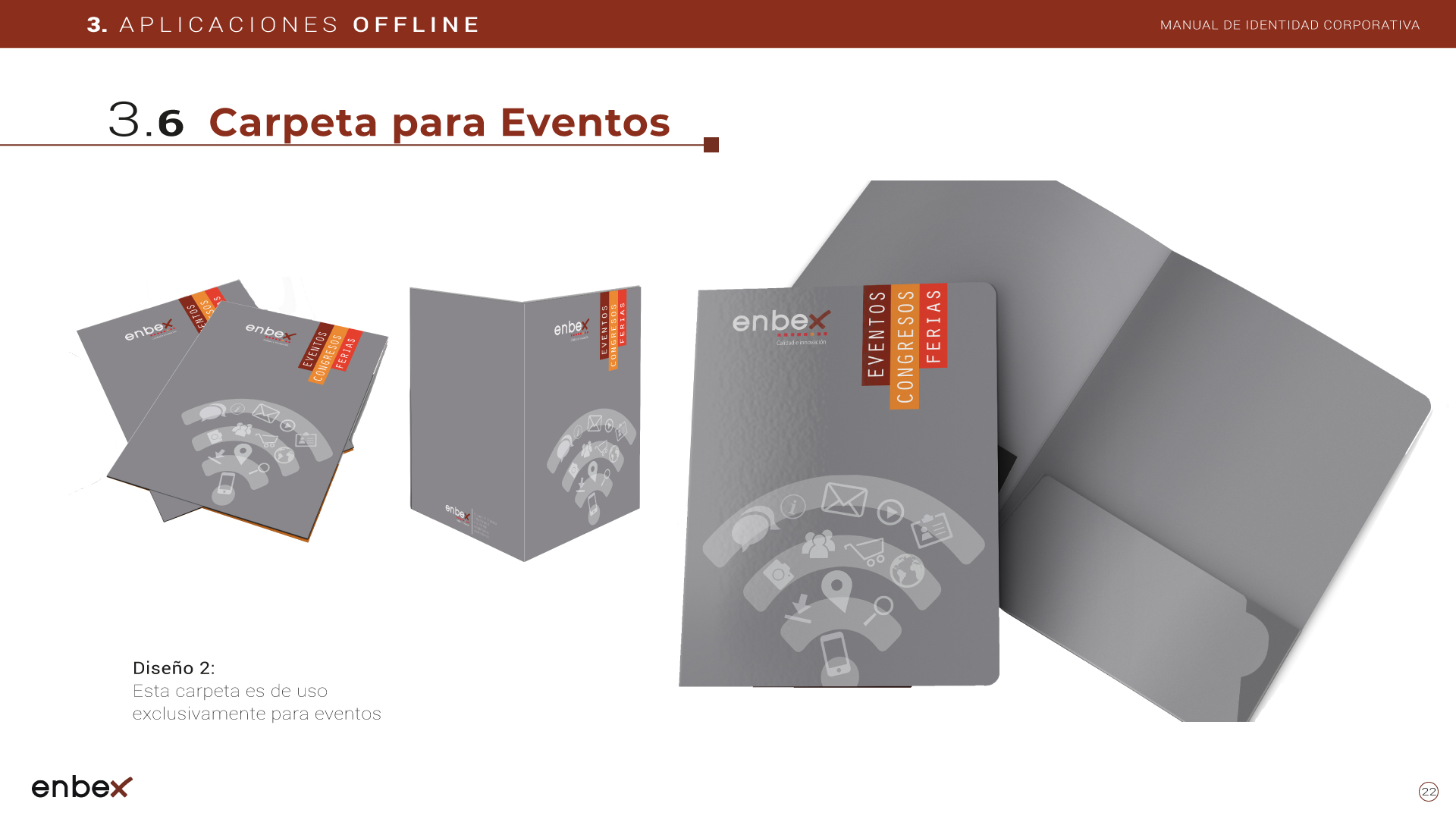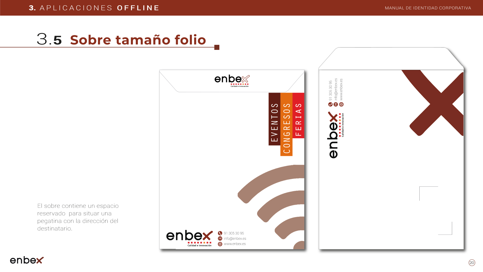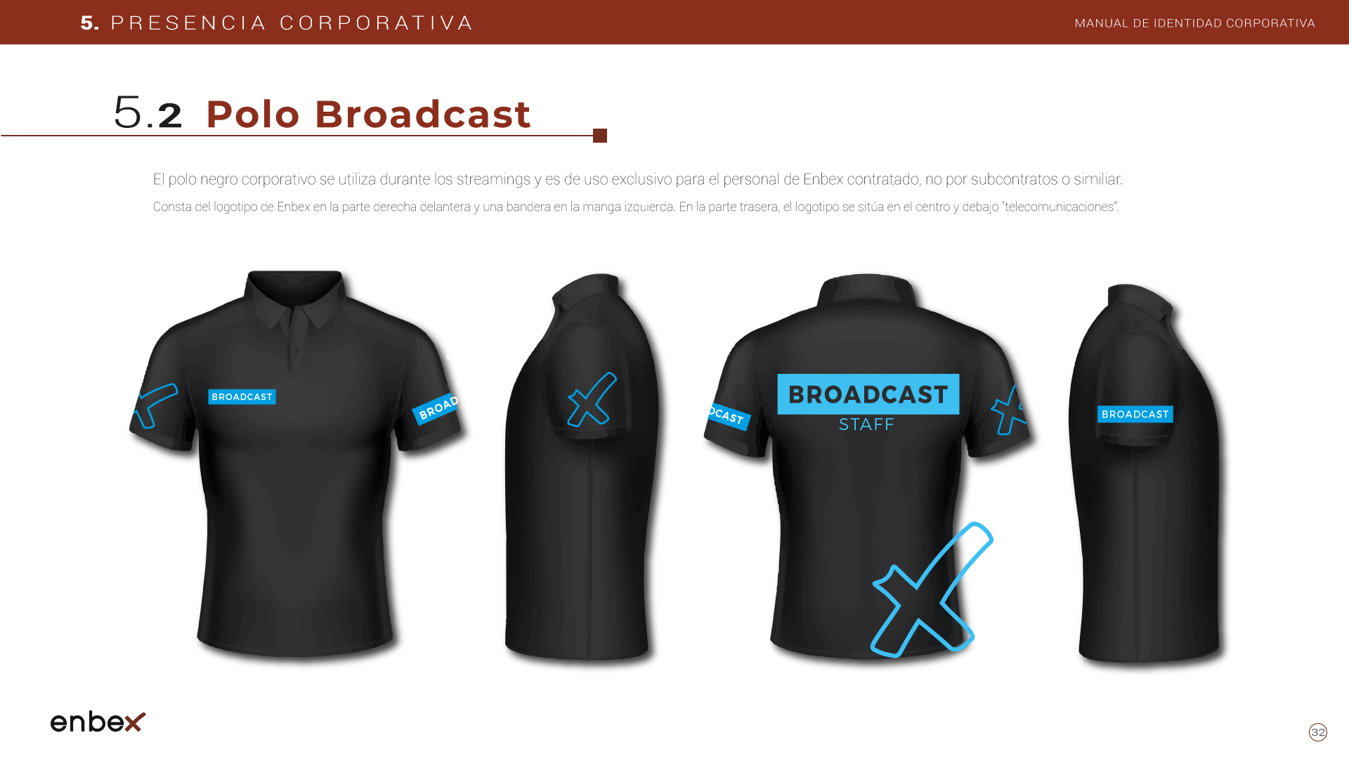 Diseño, maquetación y edición del primer manual de Identidad Corporativa de Enbex. Elaboración completa de todo el contenido, así como todas y cada una de las aplicaciones de papelería (carpetas, folio, sobres, etc.) y aplicaciones online. En este manual no llegaron a incluirse los polos corporativos de Broadcast, pero están individuales en este portfolio.
