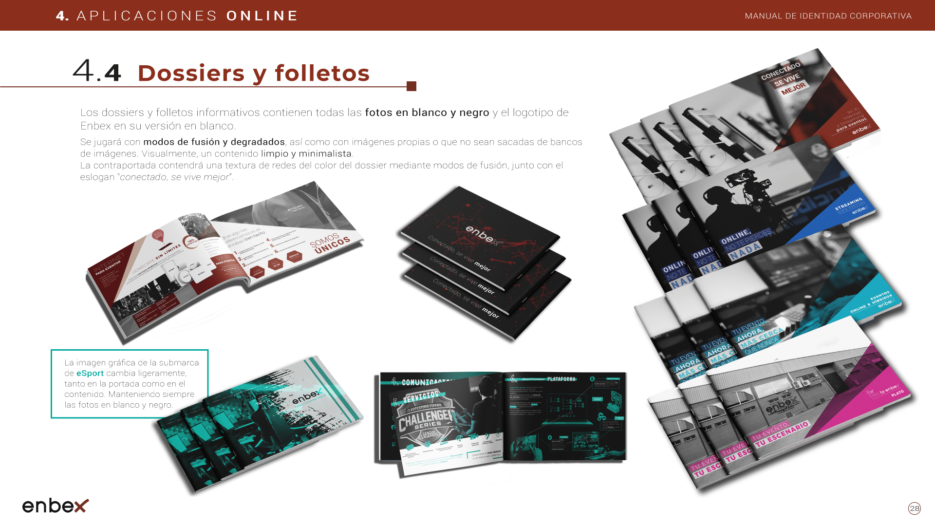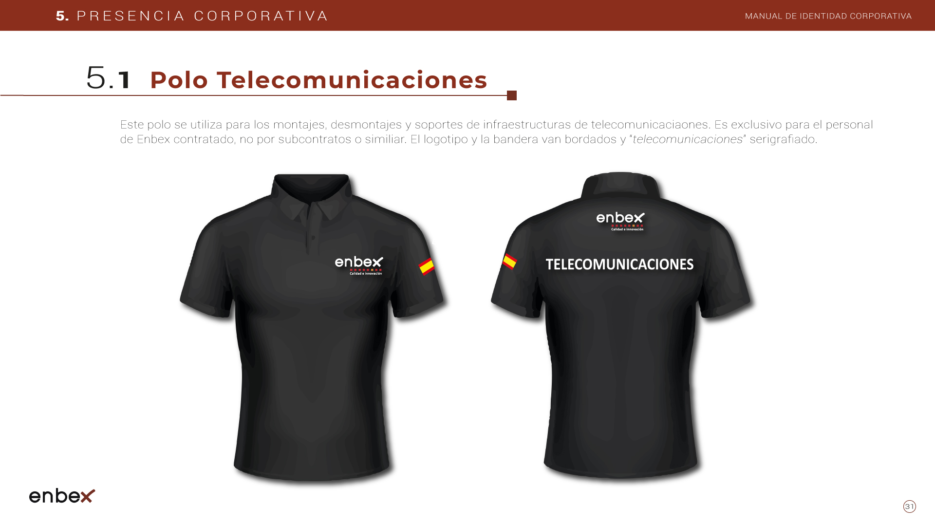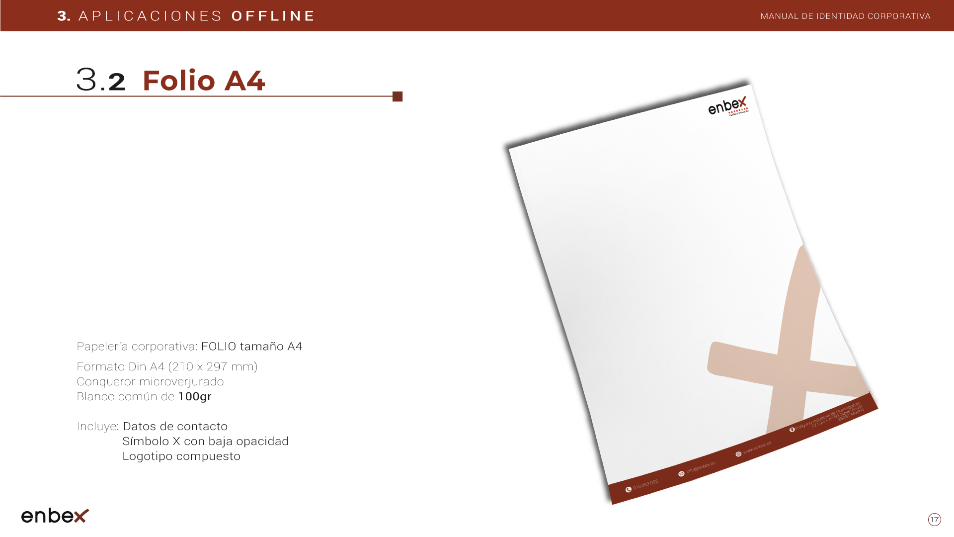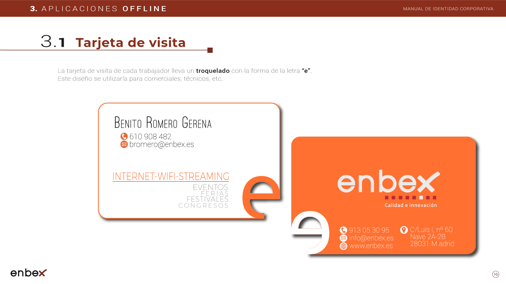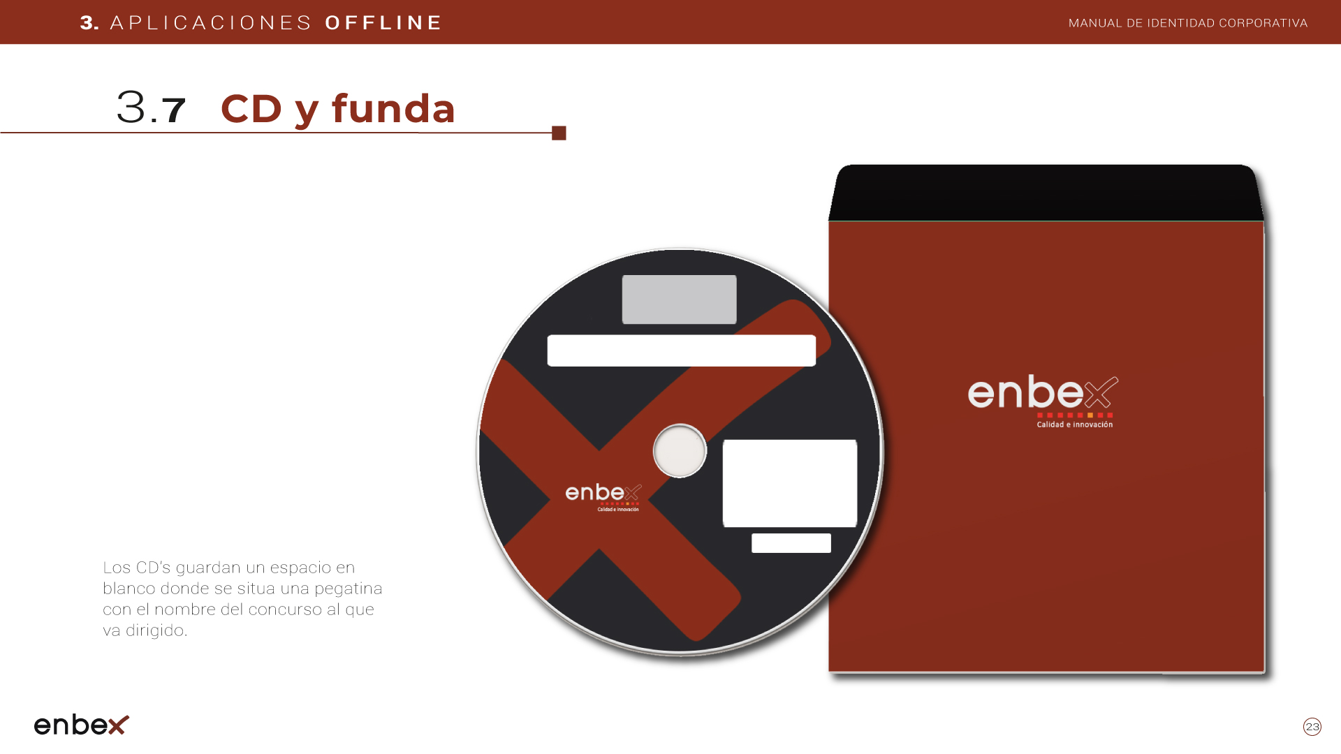 Diseño, maquetación y edición del primer manual de Identidad Corporativa de Enbex. Elaboración completa de todo el contenido, así como todas y cada una de las aplicaciones de papelería (carpetas, folio, sobres, etc.) y aplicaciones online. En este manual no llegaron a incluirse los polos corporativos de Broadcast, pero están individuales en este portfolio.