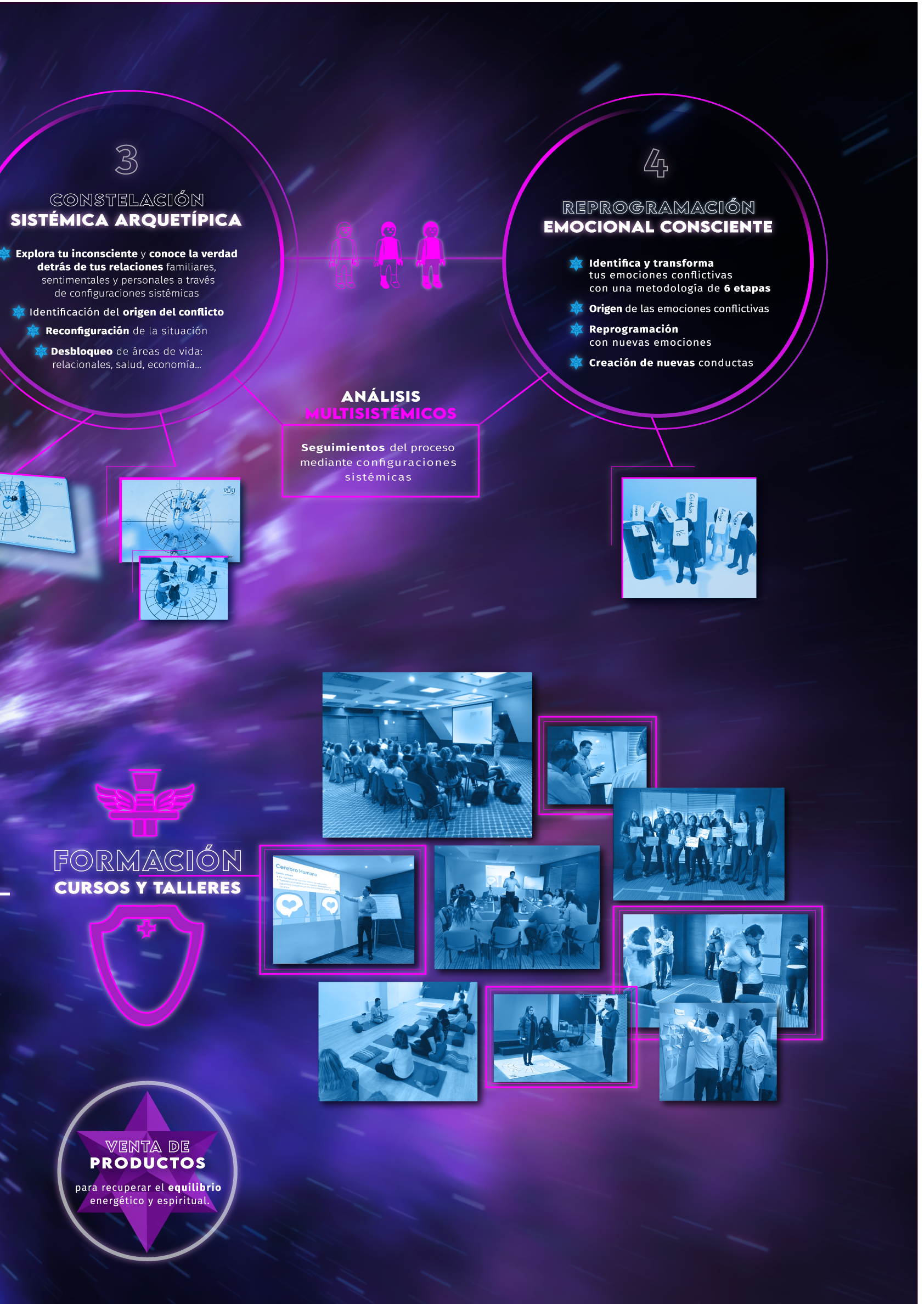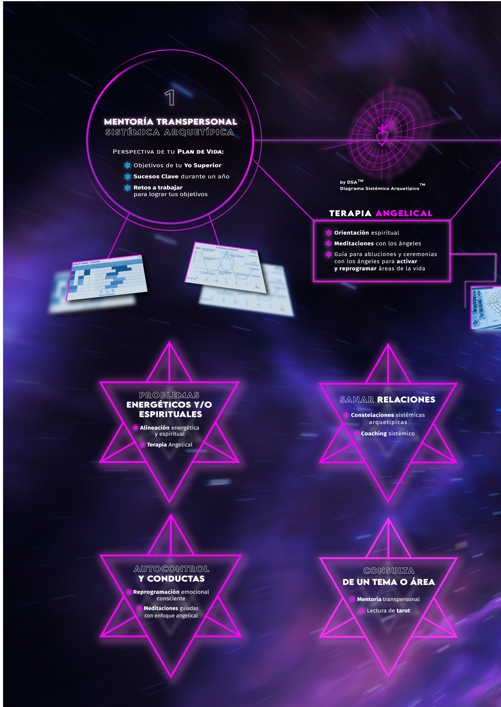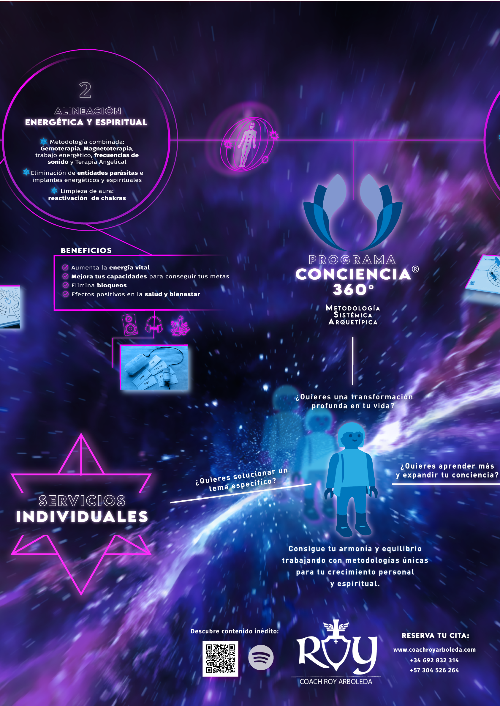 El diseño contiene todos los servicios desglosados que ofrece el propietario, Roy Arboleda. Este mismo diseño se utilizó también para la Feria Esotérica de Madrid (octubre 2024). El tamaño era inferior para un biombo de 177×83,5cm en el que se colocó.